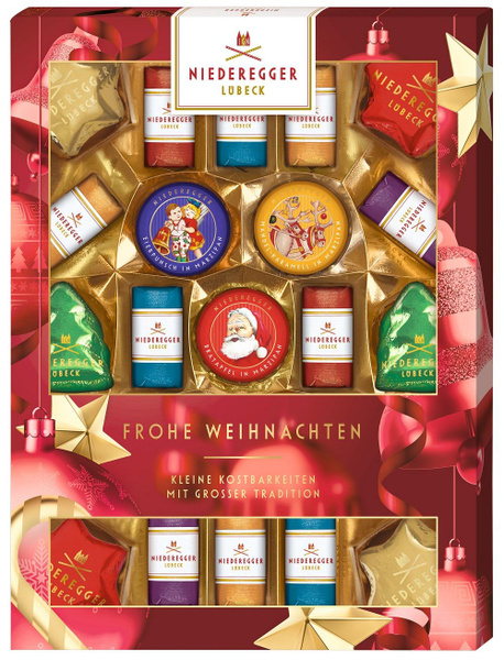 Это благородный подарок в холодное время года. В этой изысканной подарочной упаковке вы найдете различные деликатесы из марципана, соблазняющие зимними нотками. Удовольствие, которое стоит увидеть. Настоящая находка для тех, кто ценит качественные сладости. Конфеты произведены семейной компанией по оригинальному рецепту, который переходит из поколения в поколение. Марципан отличается выразительным вкусом и невероятным ароматом, который обеспечивает особый способ приготовления миндальной массы. Пралине в сочетании с темным и молочным шоколадом точно понравится каждому. Благодаря красочной упаковке набор станет замечательным подарком к Новому году.